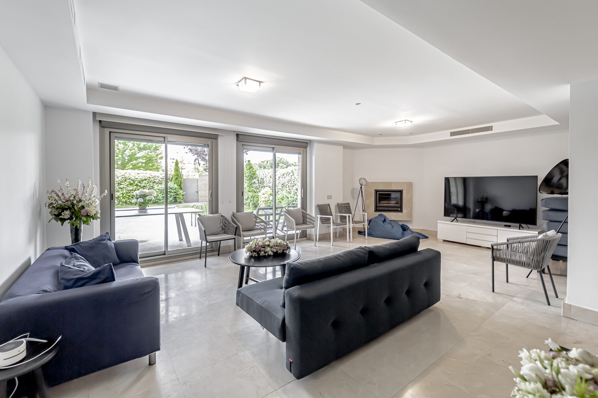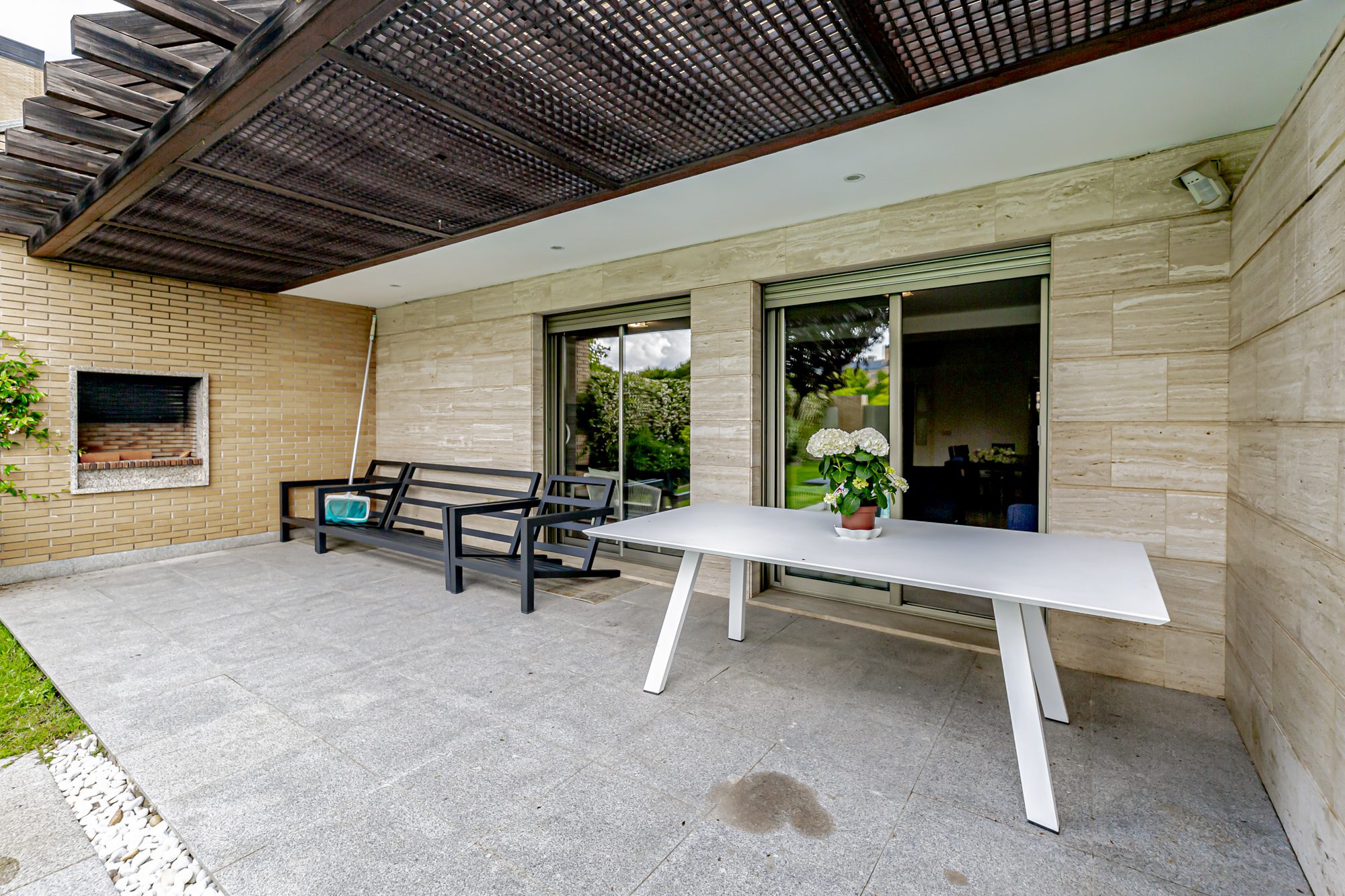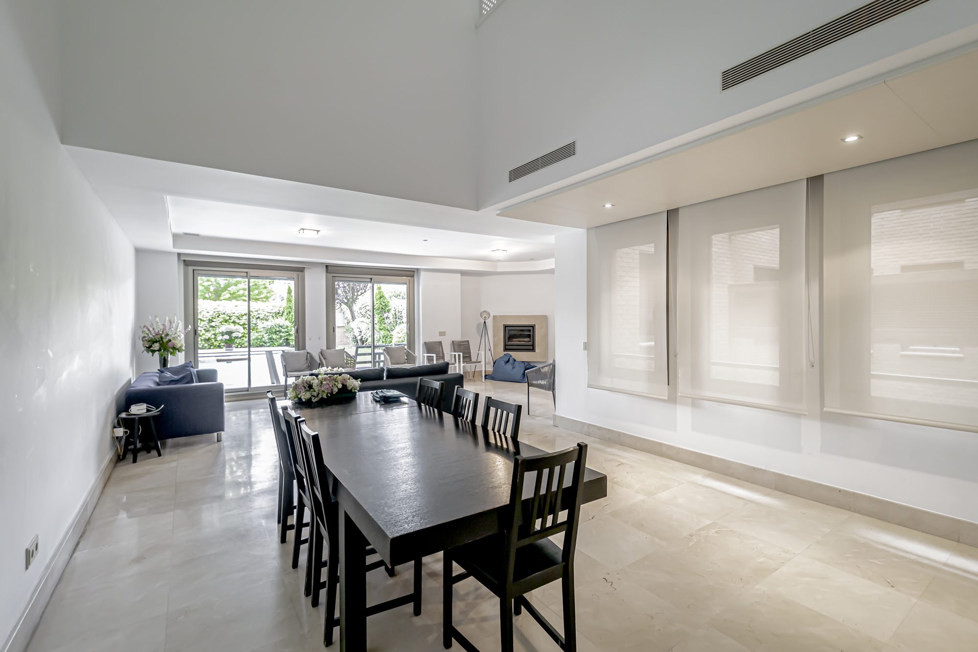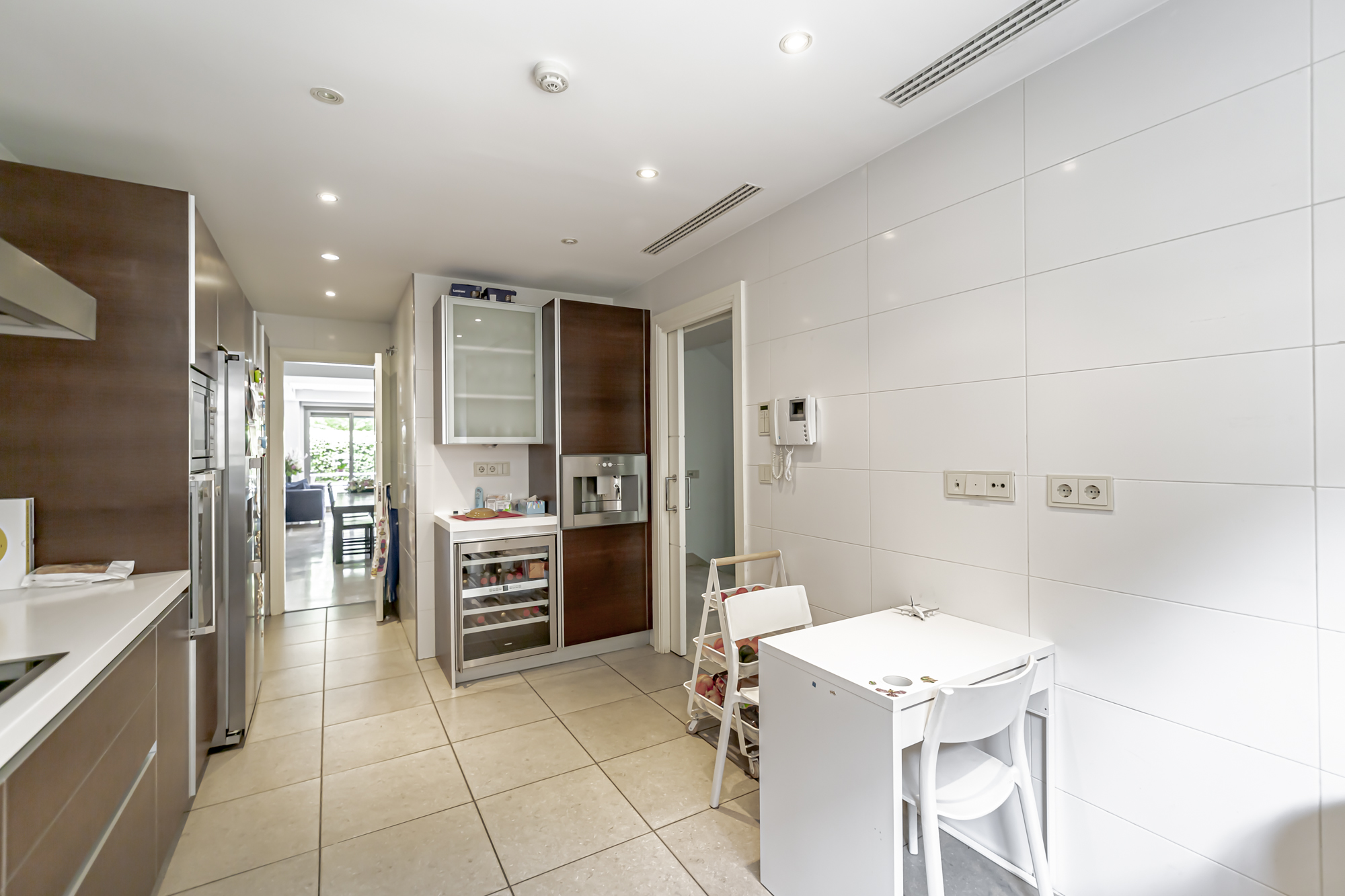 La casa se distribuye en cuatro plantas. En la primera planta se encuentra una cocina equipada con electrodomésticos GAGGENAU, encimeras de corian y muebles de Gunni, un despacho, un aseo, un salón-comedor con techos altos y un porche con barbacoa integrada, jardín privado y piscina.
