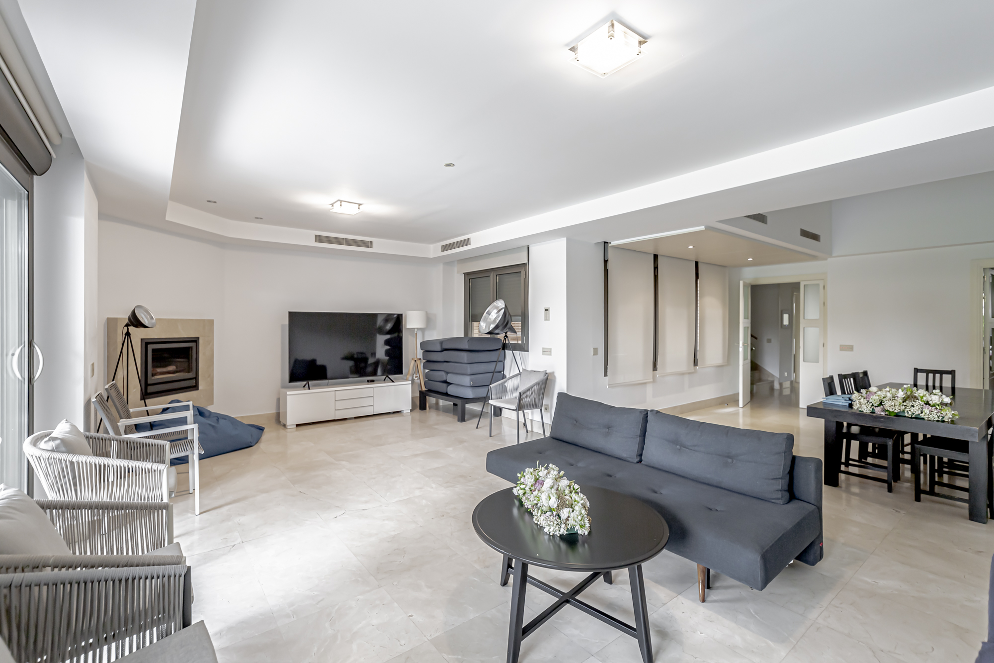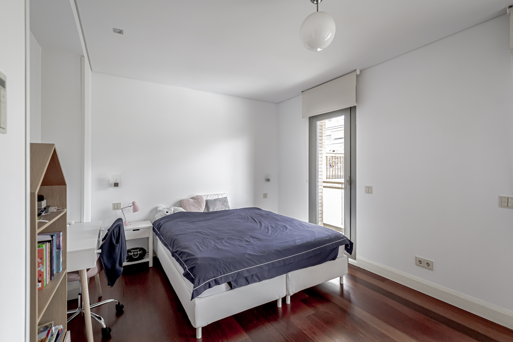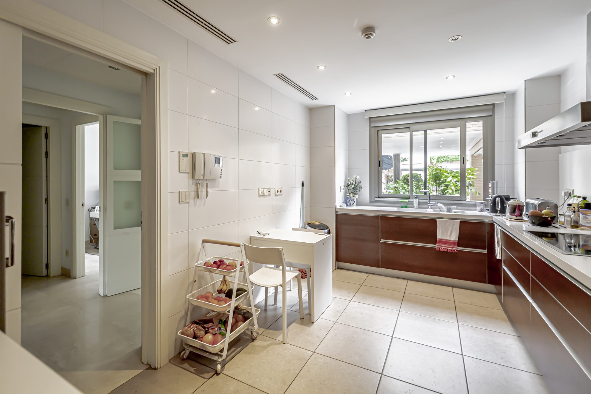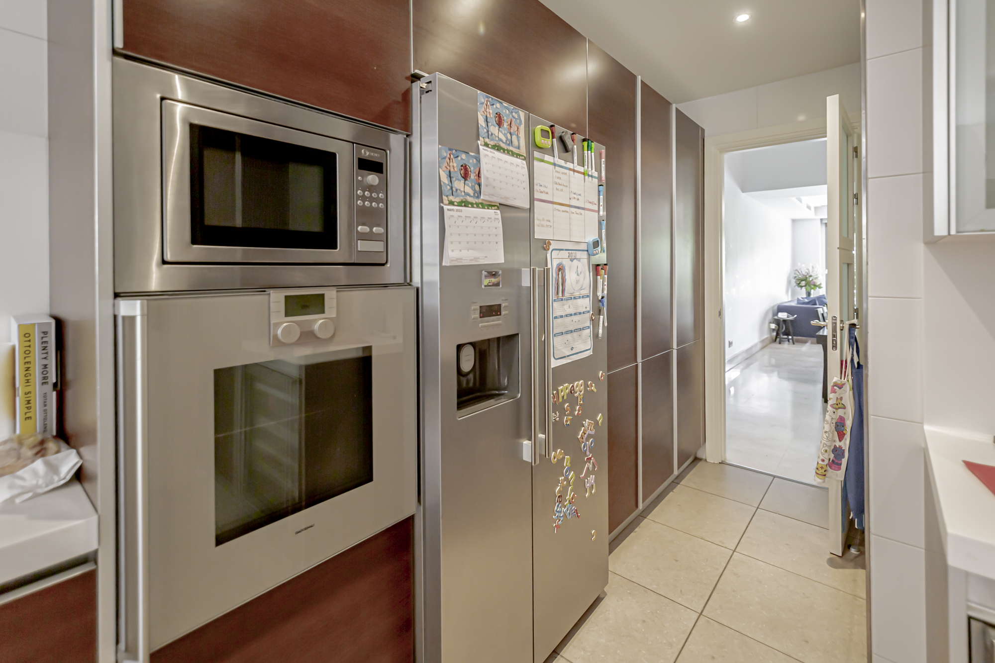 La casa se distribuye en cuatro plantas. En la primera planta se encuentra una cocina equipada con electrodomésticos GAGGENAU, encimeras de corian y muebles de Gunni, un despacho, un aseo, un salón-comedor con techos altos y un porche con barbacoa integrada, jardín privado y piscina.