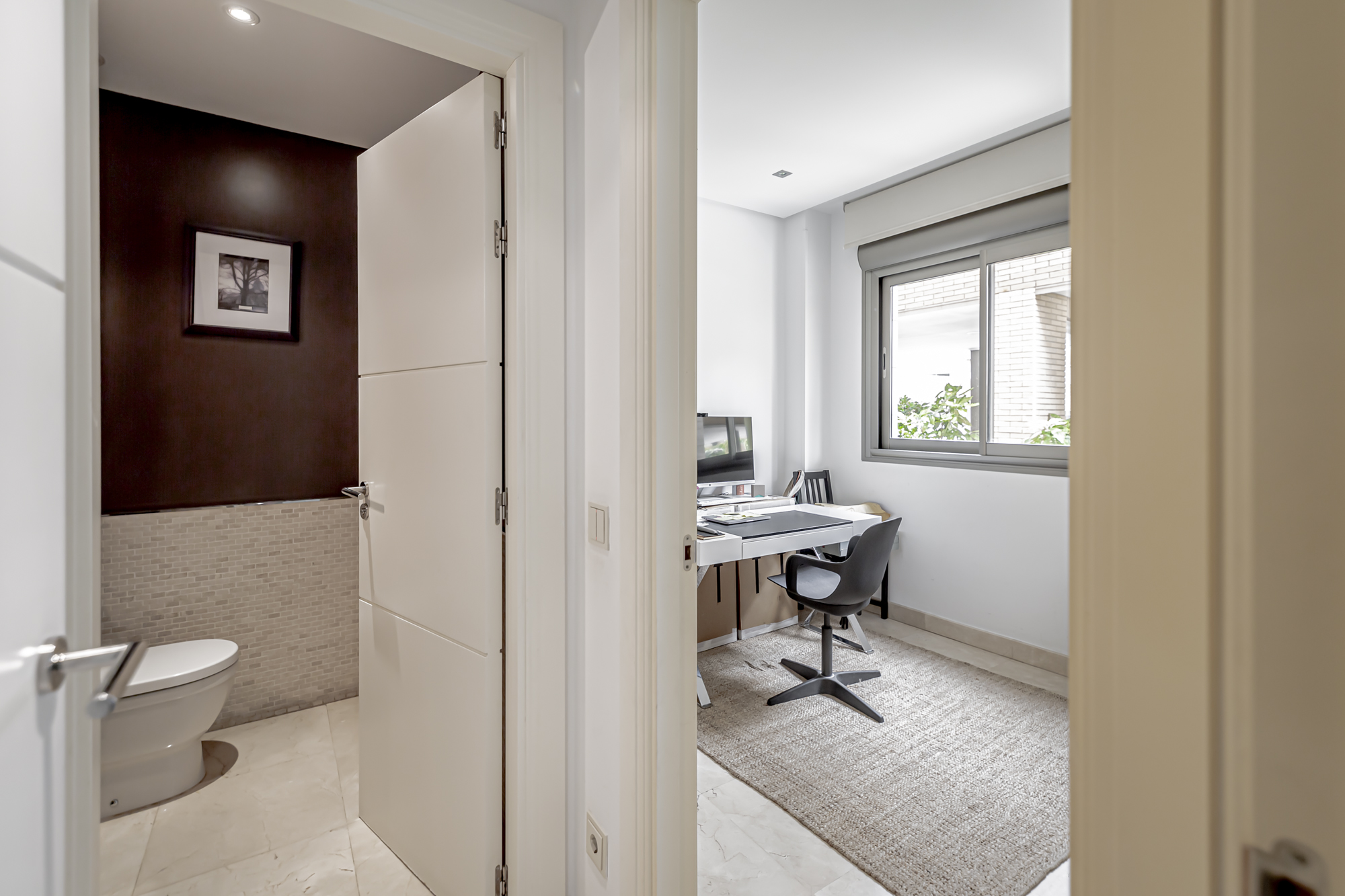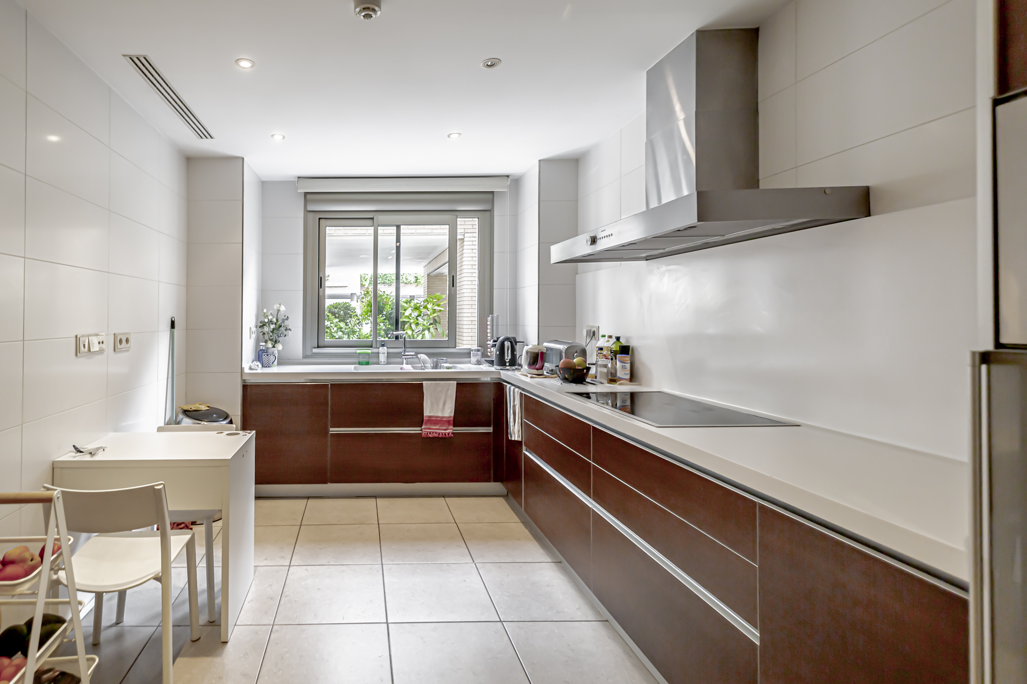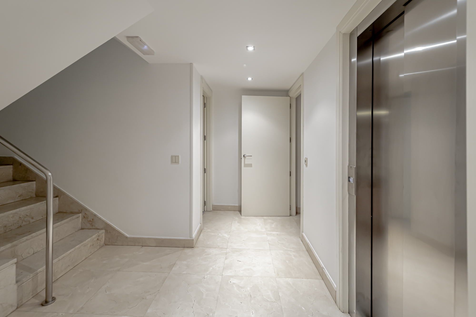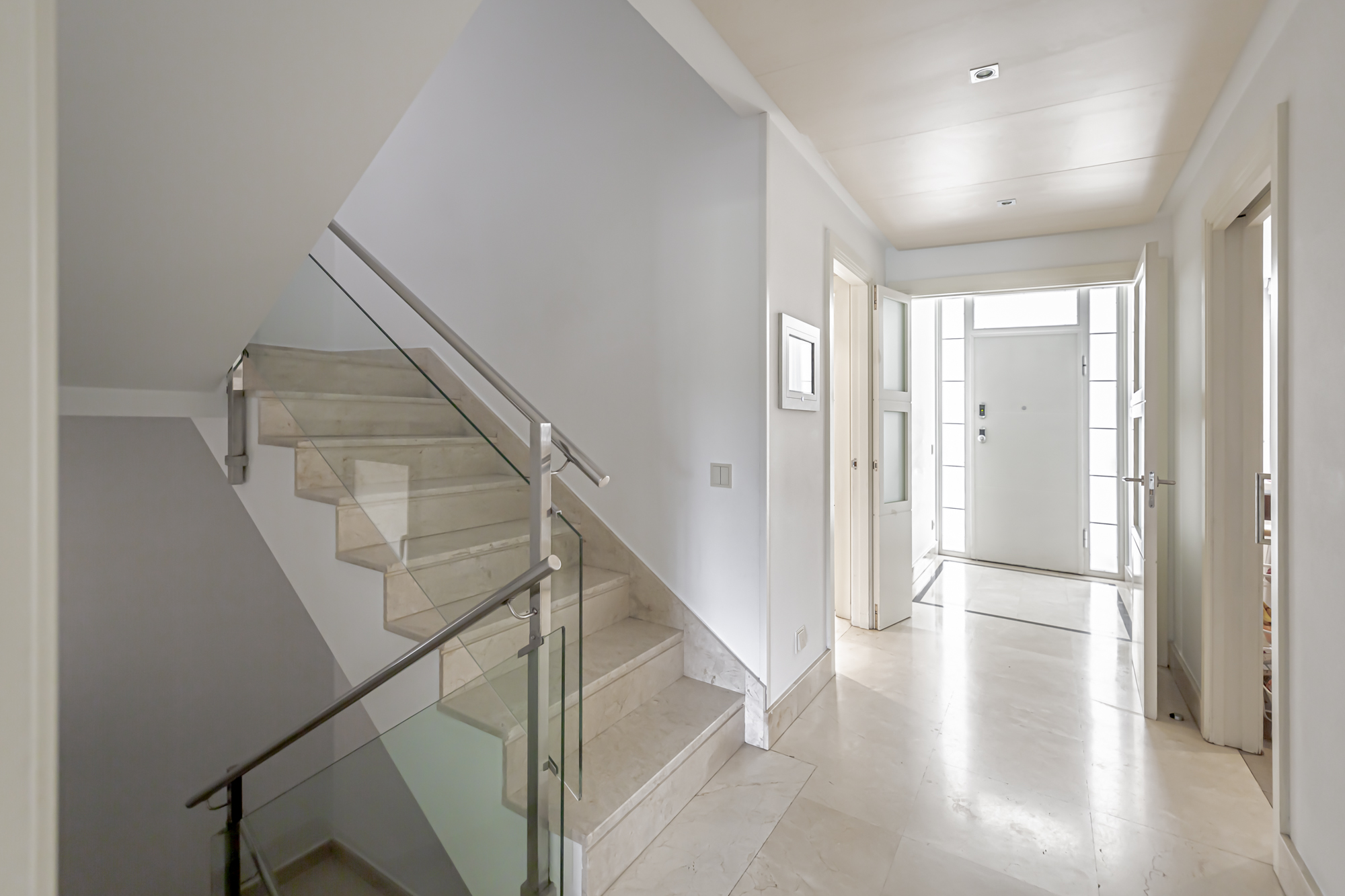 La casa se distribuye en cuatro plantas. En la primera planta se encuentra una cocina equipada con electrodomésticos GAGGENAU, encimeras de corian y muebles de Gunni, un despacho, un aseo, un salón-comedor con techos altos y un porche con barbacoa integrada, jardín privado y piscina.