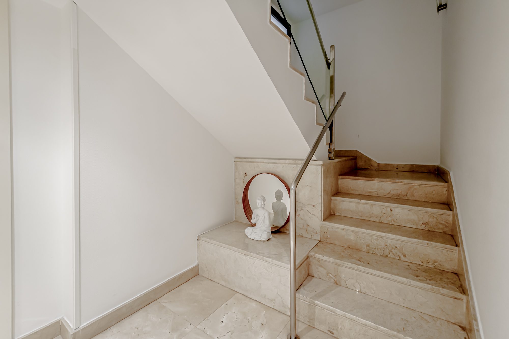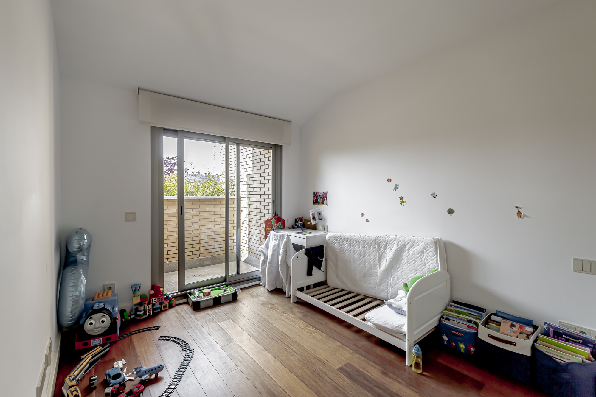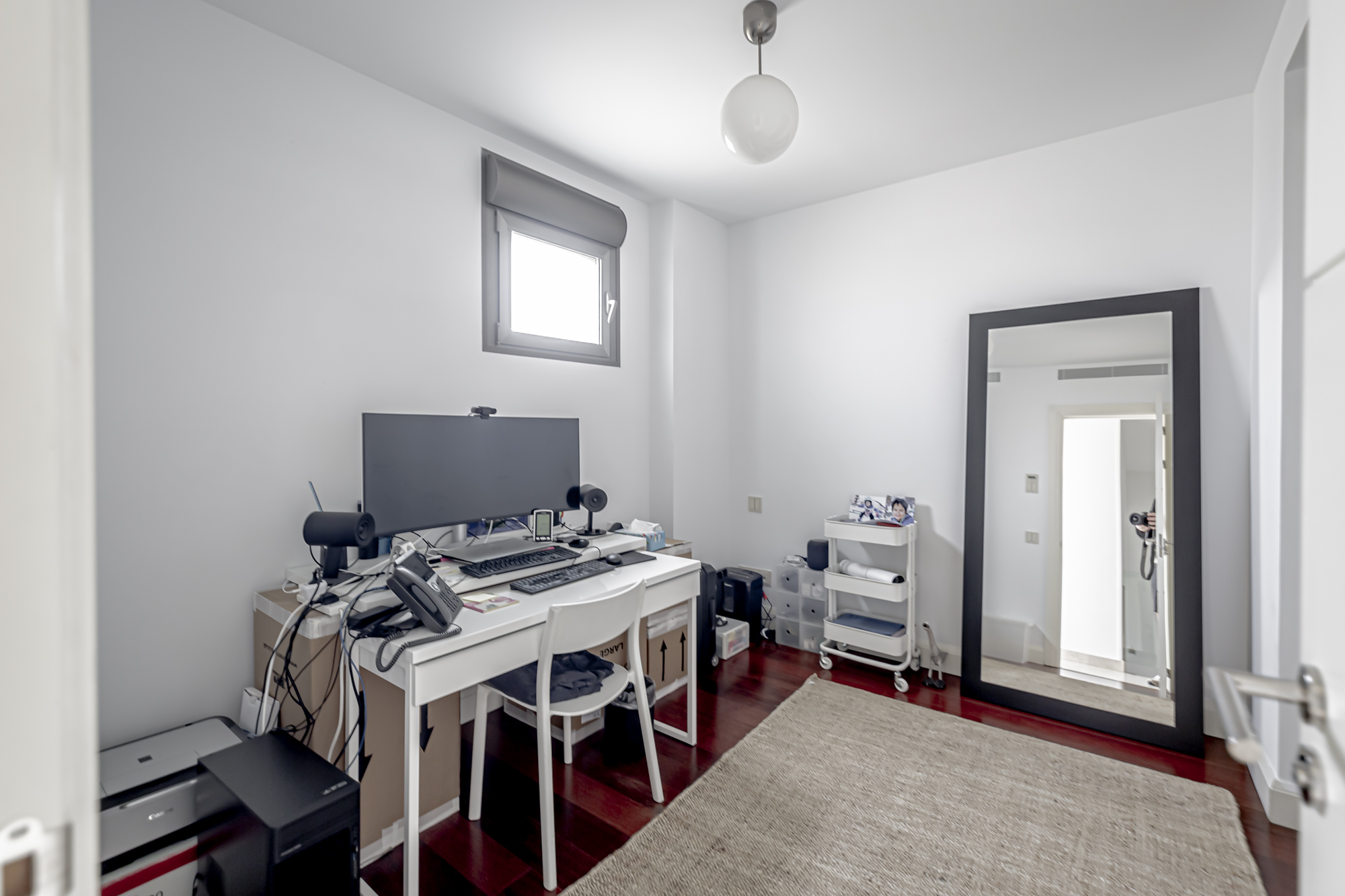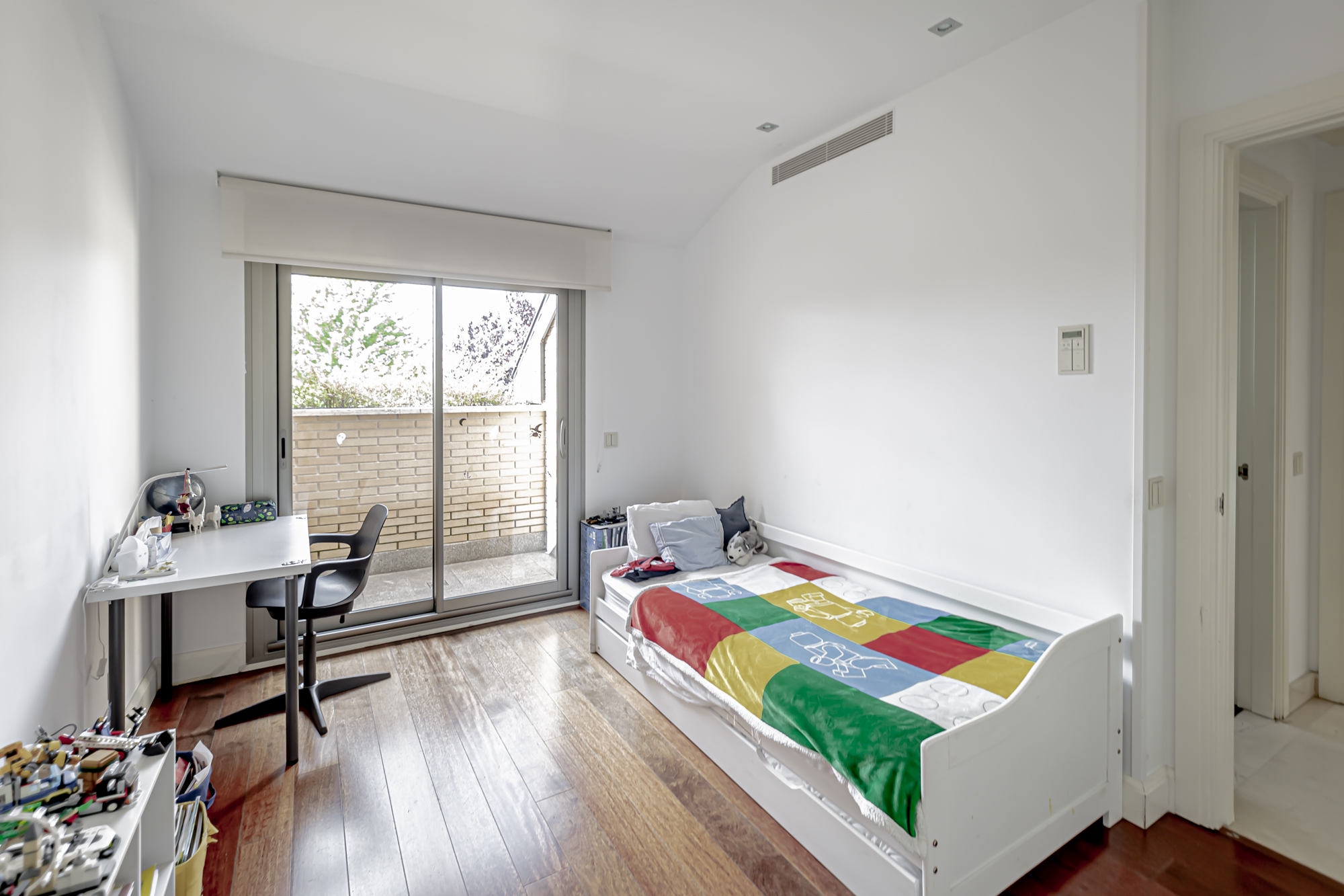 La casa se distribuye en cuatro plantas. En la primera planta se encuentra una cocina equipada con electrodomésticos GAGGENAU, encimeras de corian y muebles de Gunni, un despacho, un aseo, un salón-comedor con techos altos y un porche con barbacoa integrada, jardín privado y piscina.